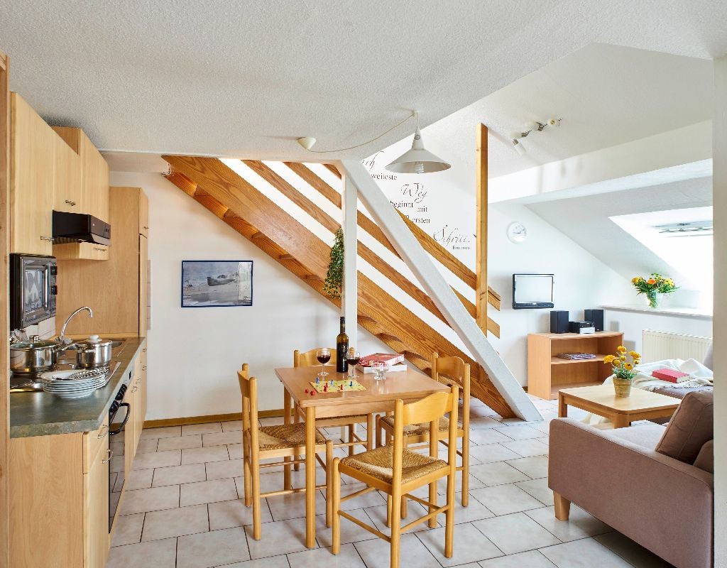Auf dem Traberhof bieten wir Ihnen mit der FeWo Nummer 13 eine Ferienwohnung bei Hooksiel für 4 Personen. Gelegen im ersten Stock finden Sie in dieser gemütlichen Ferienwohnung über zwei Ebenen jede Menge Platz. Die Aufteilung der Ferienwohnung ist besonders für Familien toll: Während die Kinder im oberen Schlafzimmer erschöpft von der frischen Nordseeluft einschlafen und von den Erlebnissen des letzten Tages träumen, genießen die Eltern ihre Urlaubsruhe im großen Wohn- Esszimmer. Im Bad mit ebenerdiger Dusche starten alle frisch in den Tag.